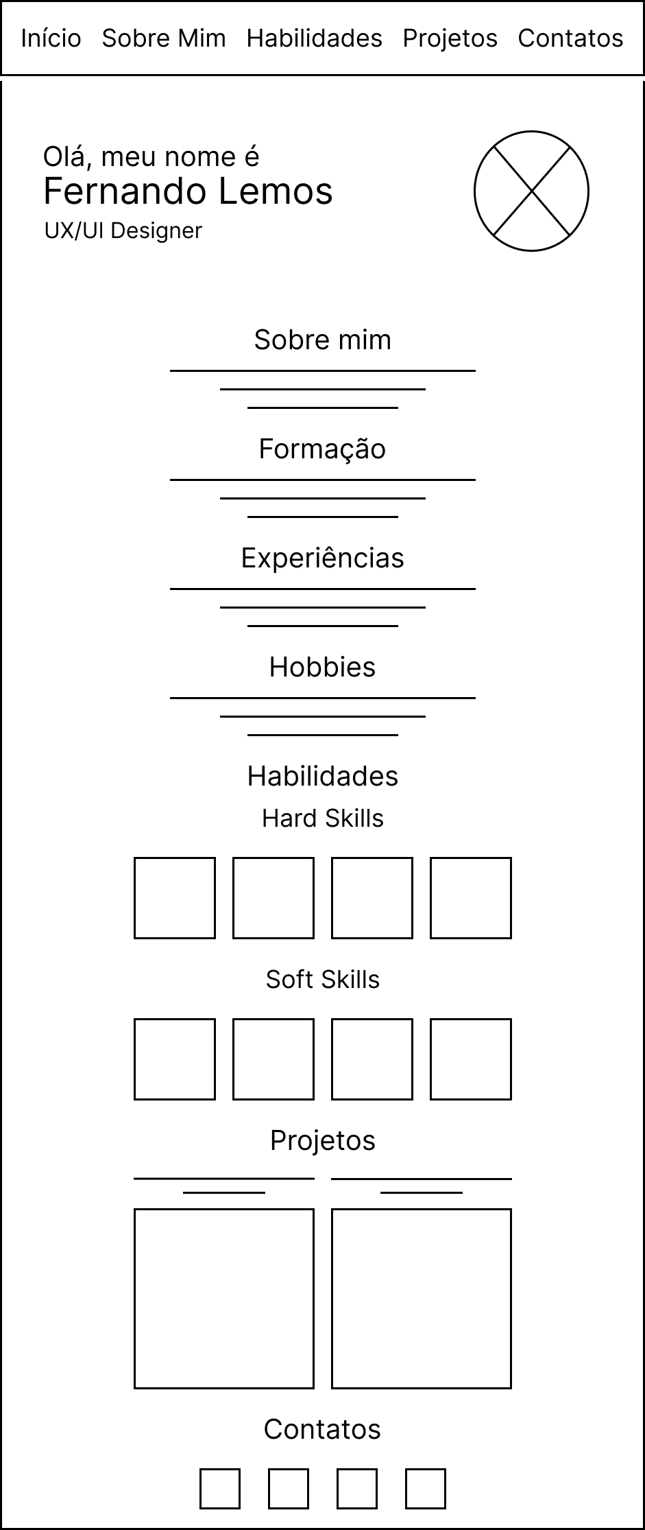 Antes de partir para os protótipos visuais, comecei organizando toda a estrutura do conteúdo em um wireframe de baixa fidelidade. O foco aqui foi desenhar uma jornada clara e objetiva para o usuário, principalmente pensando nos diferentes perfis que acessariam o portfólio — recrutadores, designers e colegas da área.